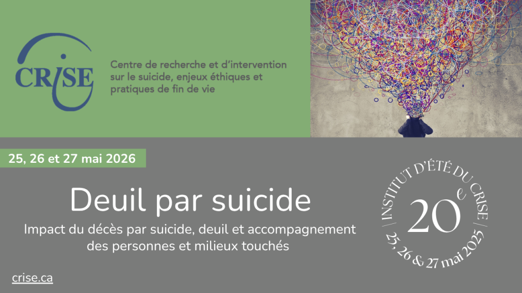 Le Centre de recherche et d’intervention sur le suicide, enjeux éthiques et pratiques de fin de vie (CRISE) vous invite à son 20e institut d’été – Deuil par suicide – Impact du décès par suicide, deuil et accompagnement des personnes et milieux touchés.