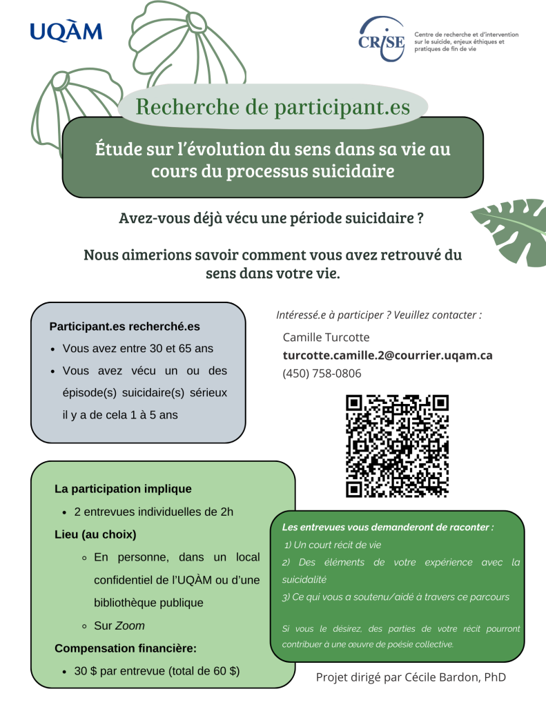 Camille Turcotte, étudiante au doctorat en psychologie, sous la supervision de Cécile Bardon, est à la recherche d’adultes âgé·e·s de 30 à 65 ans, qui ont vécu un épisode suicidaire dans les 5 dernières années, pour participer à une recherche. Celle-ci a pour objectif de mieux comprendre comment le sentiment de sens dans sa vie évolue au cours du processus suicidaire.